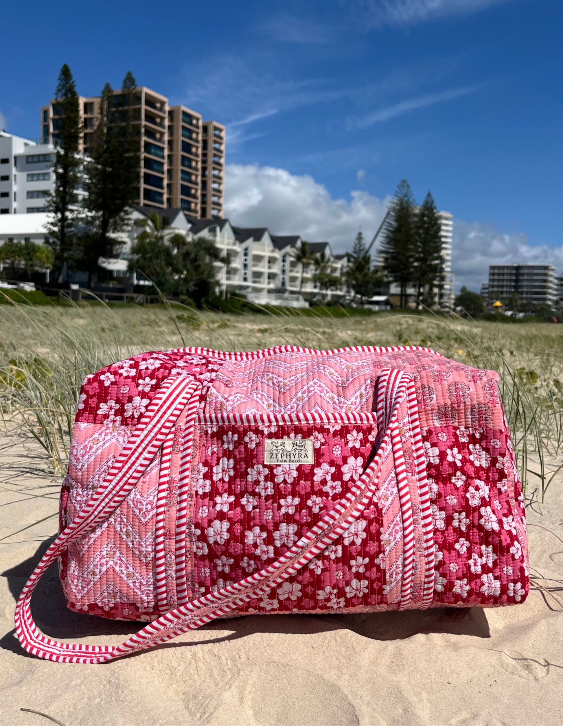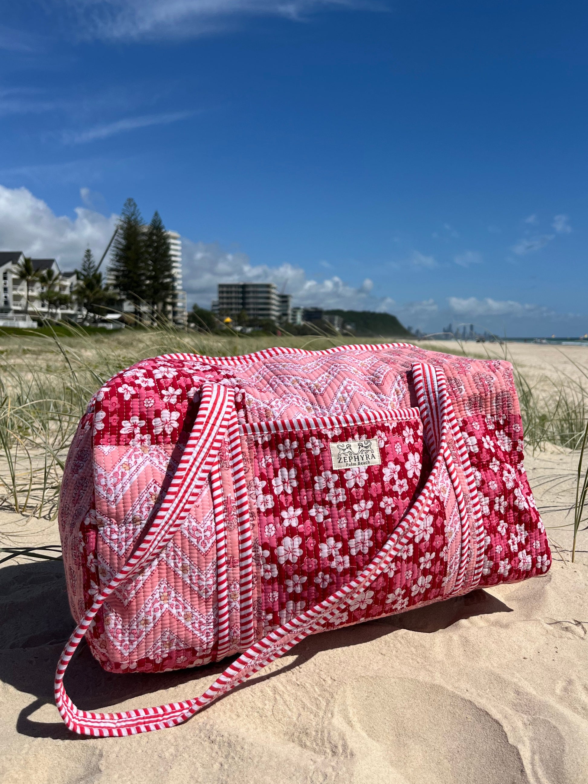 The Hibiscus Pink Weekender infuses your travels with tropical charm. Handcrafted from premium quilted cotton, this spacious bag is perfect for weekend getaways, beach days, and picnics. It features an internal pocket for organization, an external pocket for easy access, and a durable double-lined design to keep your essentials stylishly secure wherever adventure takes you.